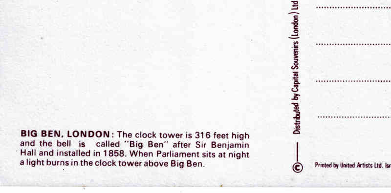 N.º 124 C - LONDON - BIG BEN. - Ed. CAPITAL SOUVENIRS (London) Ltd. 8 Shorts Gardens WC2 836 2572/2382 Printed by United Artists Ltd. Israel. Published by I.V.P.Ltd. London. - SD - Dim. 10,5x14,6 cm - Col. Manuel Bóia (1986)