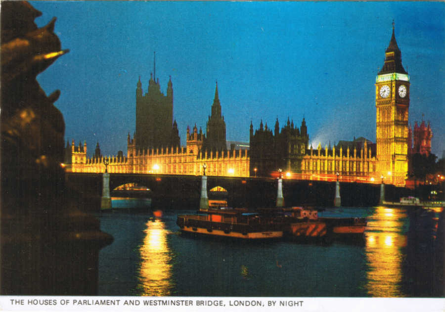 N.º LO 371 - LONDON, BY NIGHT. THE HOUSES OF PARLIAMENT AND WESTMINSTER BRIDGE. - Ed. COLOURMASTER INTERNATIONAL Photo Precision Limited, St. Ives, Huntingdon Printed in Great Britain PT9904 - SD Dim. 14,9x10,4 cm - Col. Manuel Bóia (1986).