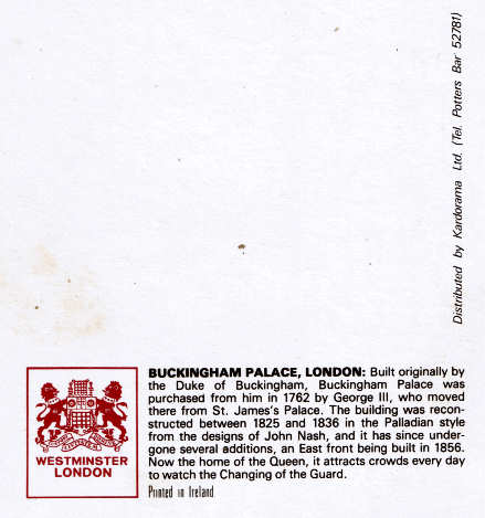 K 1 - LONDON, BUCKINGHAM PALACE - Ed. WESTMINSTER LONDON Distributed by KARDORAMA Ltd. (Tel. Potters Bar 52781) Printed in Ireland - SD Dim. 14,8x10,5 cm - Col. Manuel Bóia (1986).