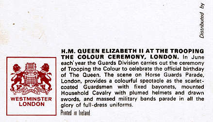 K 58 - LONDON - H.M. QUEEN ELIZABETH II AT THE TROOPING THE COLOUR CEREMONY - Ed. WESTMINSTER LONDON Distributed by KARDORAMA Ltd. (tel. Potters Bar 52781) Printed in Ireland - SD Dim. 14,9x10,5 cm - Col. Manuel Bóia (1986).