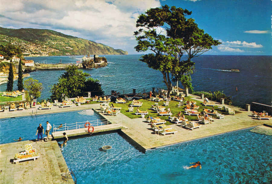 MD 118 - MADEIRA Piscina do Hotel Reid's - Ed. Hans Huber KG Agente no Funchal: F. Ribeiro, Rua Nova de S. Pedro, 27, telef. 23930 - SD - Dim. 14,8x10,4 cm. - Col. Fátima e Manuel Bóia (1975).