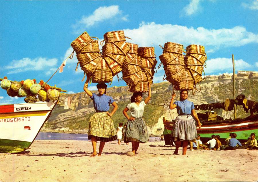Transportando os cabazes da pesca. |