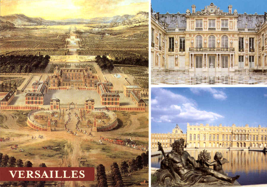 2 - Versailles: vue perspective de la place d'Armes en 1668, la cour de marbre, le parterre d'eau.