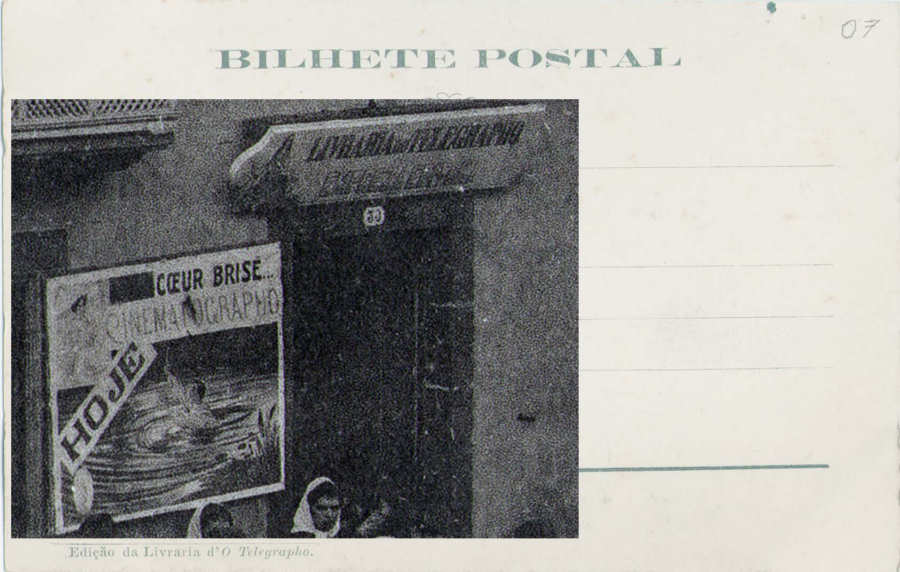 393. Livraria d'O Telegrapho. É dia de Cinematógrafo e junto à Livraria d'O Telegrapho, engalanada com bandeiras, vê-se o cartaz do filme "Coeur Brisé" (Coração partido). Será uma noite diferente.  (verso)
