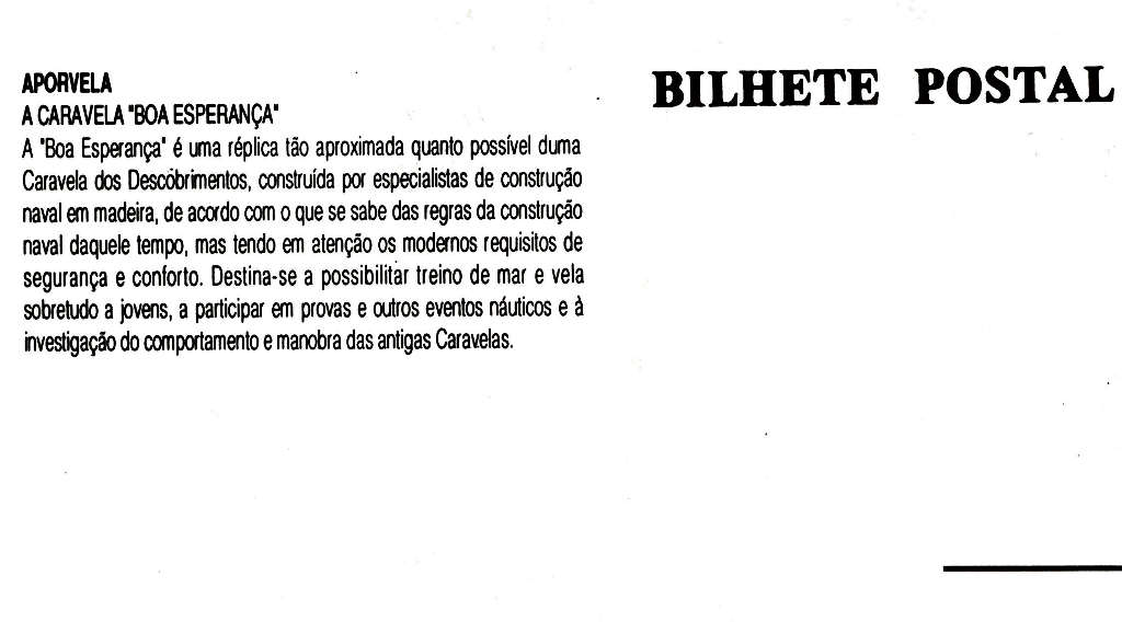 Caravela «BOA ESPERANÇA». Ver verso. Ed. não indicada. S/D. Dim.