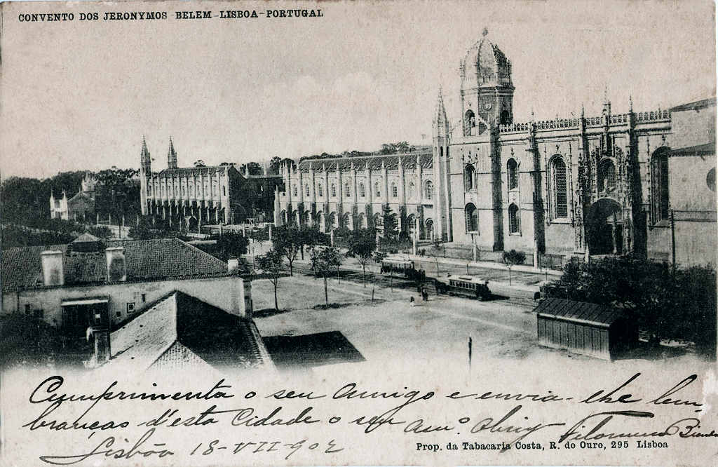 176. Convento dos Jerónymos em Belém. Notar o americano puxado por 2 animais (cerca de 1900) (verso)