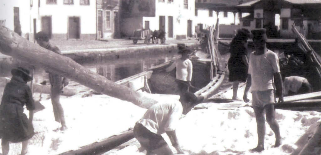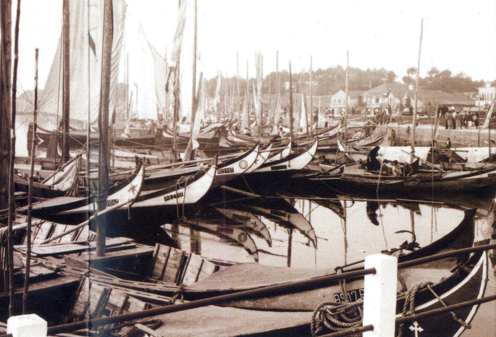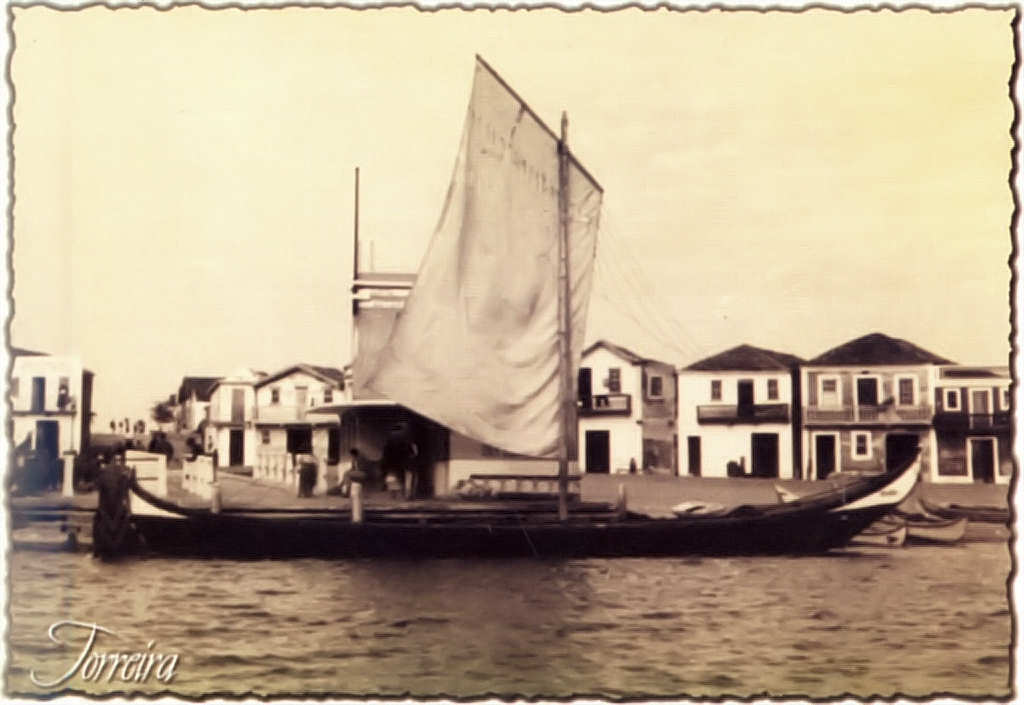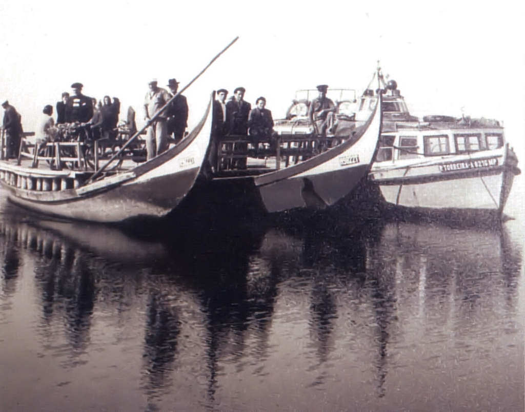 13. Dois mercanteis acoplados, rebocados por uma lancha para fazer a travessia de carros e pessoas. Fotografia de Américo Carvalho da Silva (Carvalhinho), in "Aveiro e Cultura".