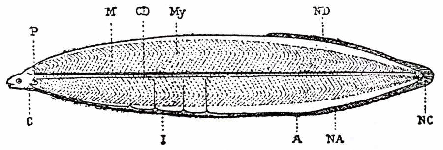 My - Miótomos; NA - Barbartana anal; NC - Barbatana caudal; ND -