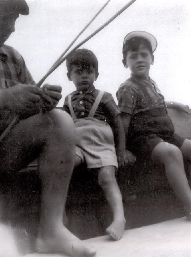 Na borda dum mercantel estão sentados meu pai, eu e meu