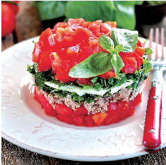 forma: uma rodela de tomate, flor de sal, orégãos, um pouco de atum,