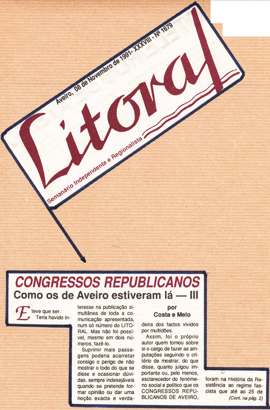 Síntese - Costa e Melo conclui, neste artigo, a publicação de algumas das partes que achou serem mais relevantes da comunicação que proferiu no Congresso sobre a vida da República Portuguesa, ocorrido em Lisboa em Outubro de 1991.O seu autor recorda a importância que os congressos republicanos realizados em Aveiro durante a ditadura tiveram para o país, quer a nível social, quer político, salientando terem sido um marco"na história da resistência ao regime fascista que até ao 25 de Abril nos asfixiou."
