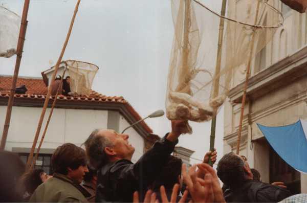 Apanhando as cavacas lançadas do cimo da capela. Fotografia de