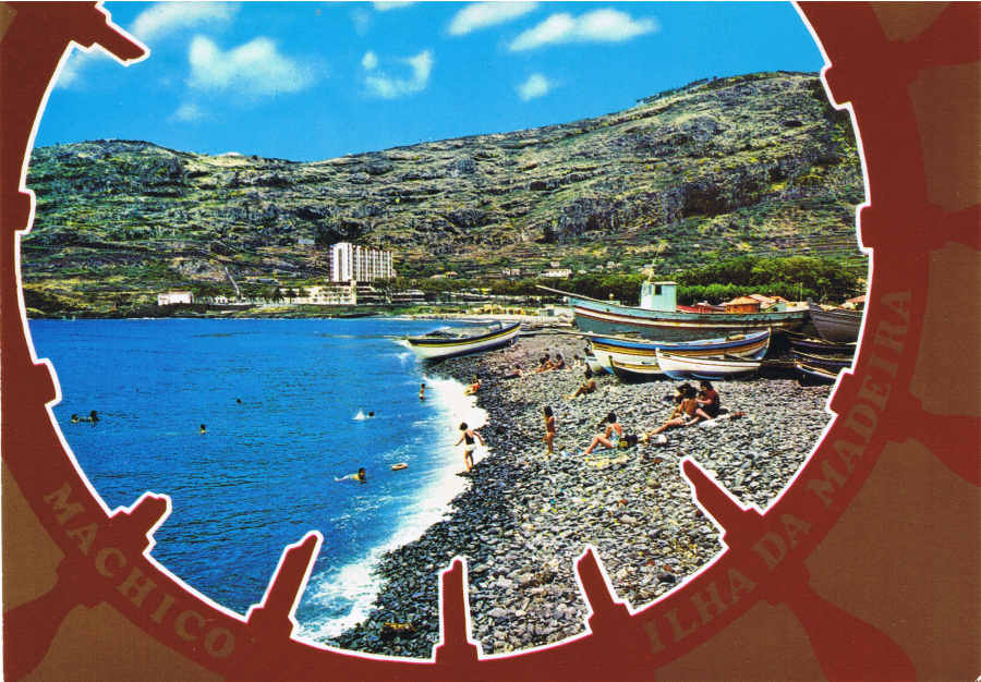 N.º 205 - MADEIRA Vista Geral da Baía de Machico - Ed. Gótica RUA N.S. DE FÀTIMA 298 PORTO REPRESENTANTE NA MADEIRA CARVÂO, MARTINS & SILVA,LDA - RUA DIREITA, 21 - FUNCHAL FABRICADO EM ITÁLIA - SD - Dim. 14,8x10,4 cm. - Col. Manuel e Fátima Bóia (1975).