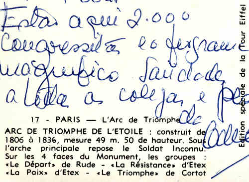 Nº 17 - Paris. Arco do Triunfo (2) - Edition speciale de la Tour Eifel - Circulado em 1966 - Dim.  14,9x10,3 cm - Col. Amílcar Monge da Silva