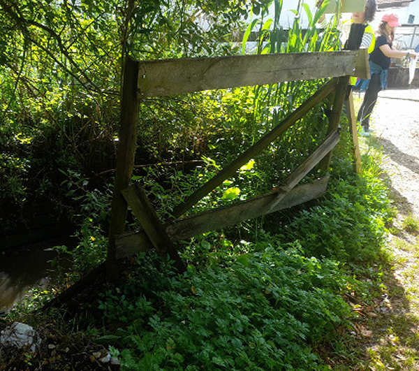 plantas invasoras; água suja; mapas/placards grafitados; árvores