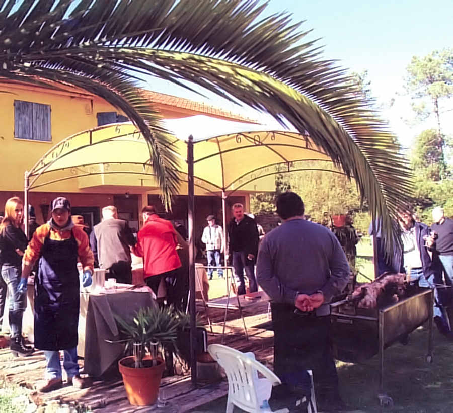 suculento porco no espeto e um belo caldo verde, servido ao ar livre.