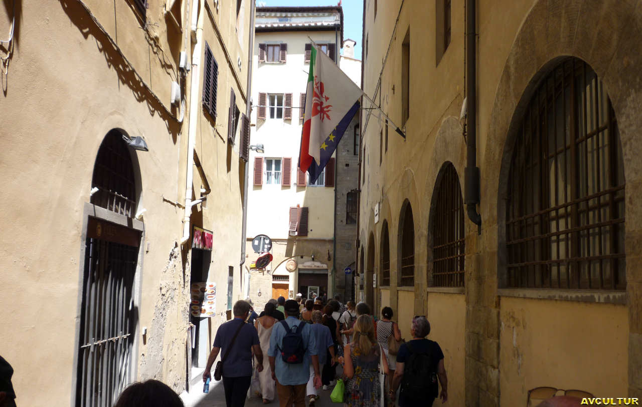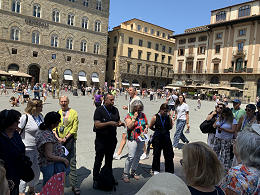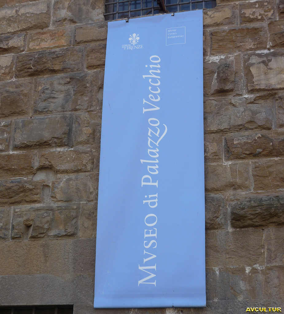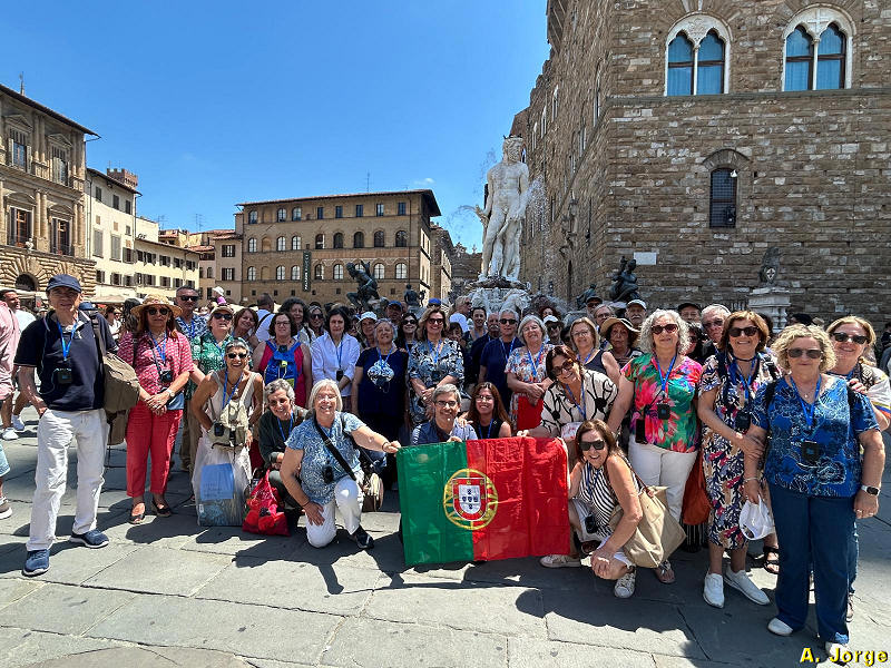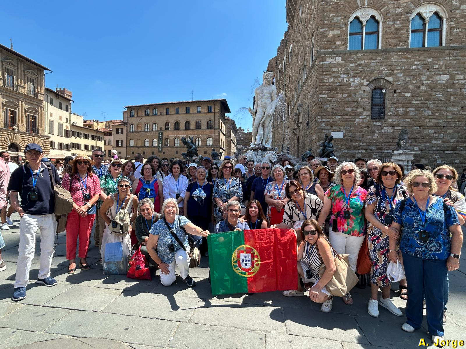 ajardinado; à direita, a cúpula da maior Sinagoga de Florença. Centrando a atenção no edifício do Palácio Velho, vê-se a varanda onde