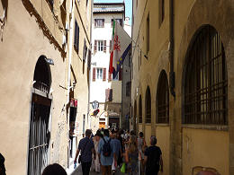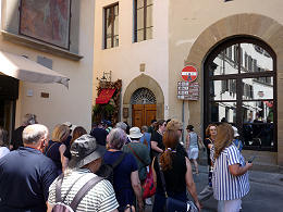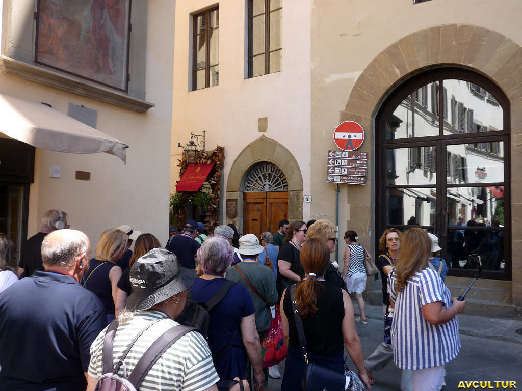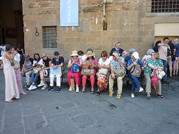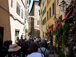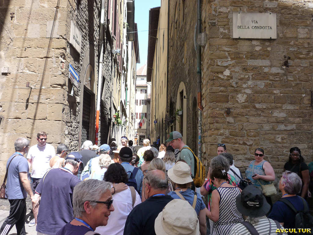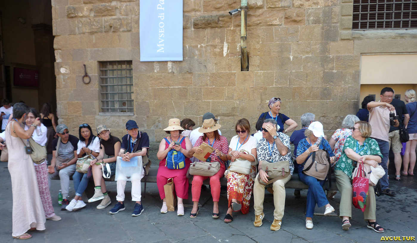 ajardinado; à direita, a cúpula da maior Sinagoga de Florença. Centrando a atenção no edifício do Palácio Velho, vê-se a varanda onde