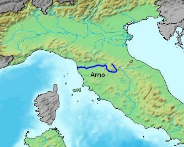 Florença e Pisa antes de desaguar no mar Tirreno. |