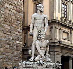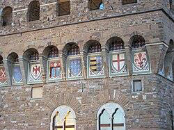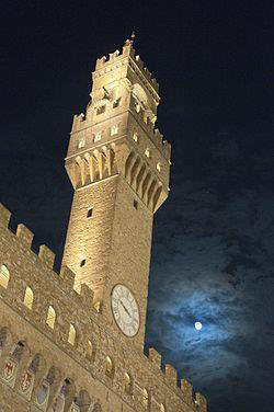 símbolos das forças fundadoras de Florença, e a Torre de Arnolfo.