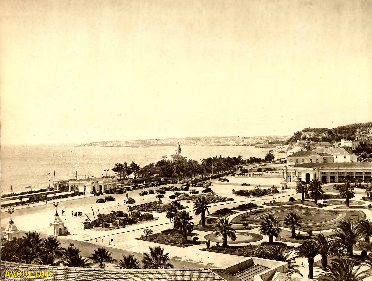 Entrada do Parque e baía de Cascais, vistas do Estoril Palácio Hotel. L'entrée du Parc et la baie de Cascais, vue prise de l'Estoril Palácio Hotel. Entrance to the Park, and the Bay of Cascais seen from the Estoril Palácio Hotel.