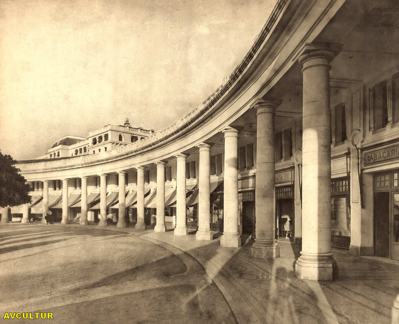 Arcadas do Parque (lado nascente) - L'arcade du parc (côté levant) - View of the Park Arcades (eastern side) - Obs.: ver sombra do fotógrafo no lado direito, com máquina de chapas de vidro sobre tripé.