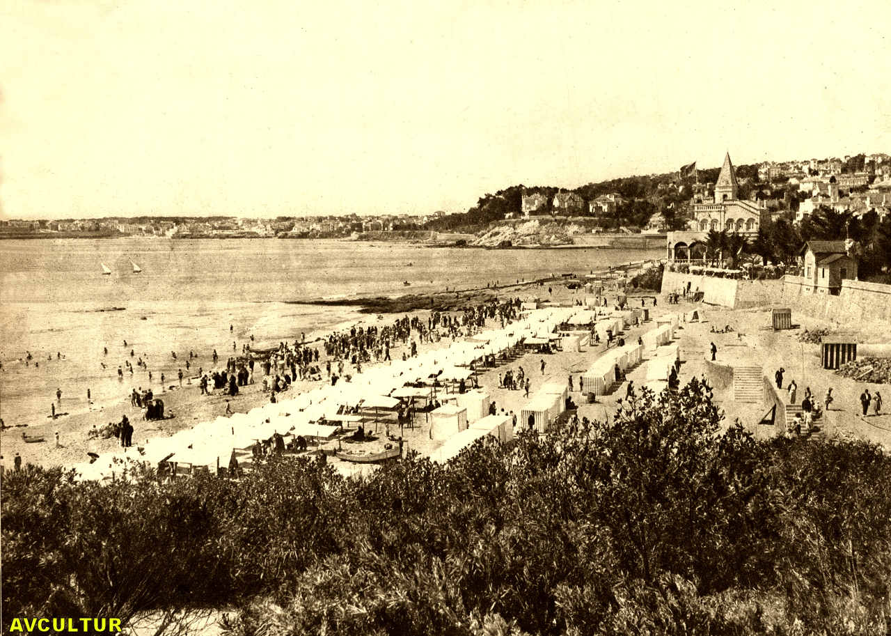 Aspecto da praia do Estoril; ao centro o Monte-Estoril e à esquerda Cascais. – La plage d'Estoril: au centre le Monte Estoril; à gauche Cascais. – A view of Estoril beach: in the center is Mont'Estoril; to the left, Cascais.