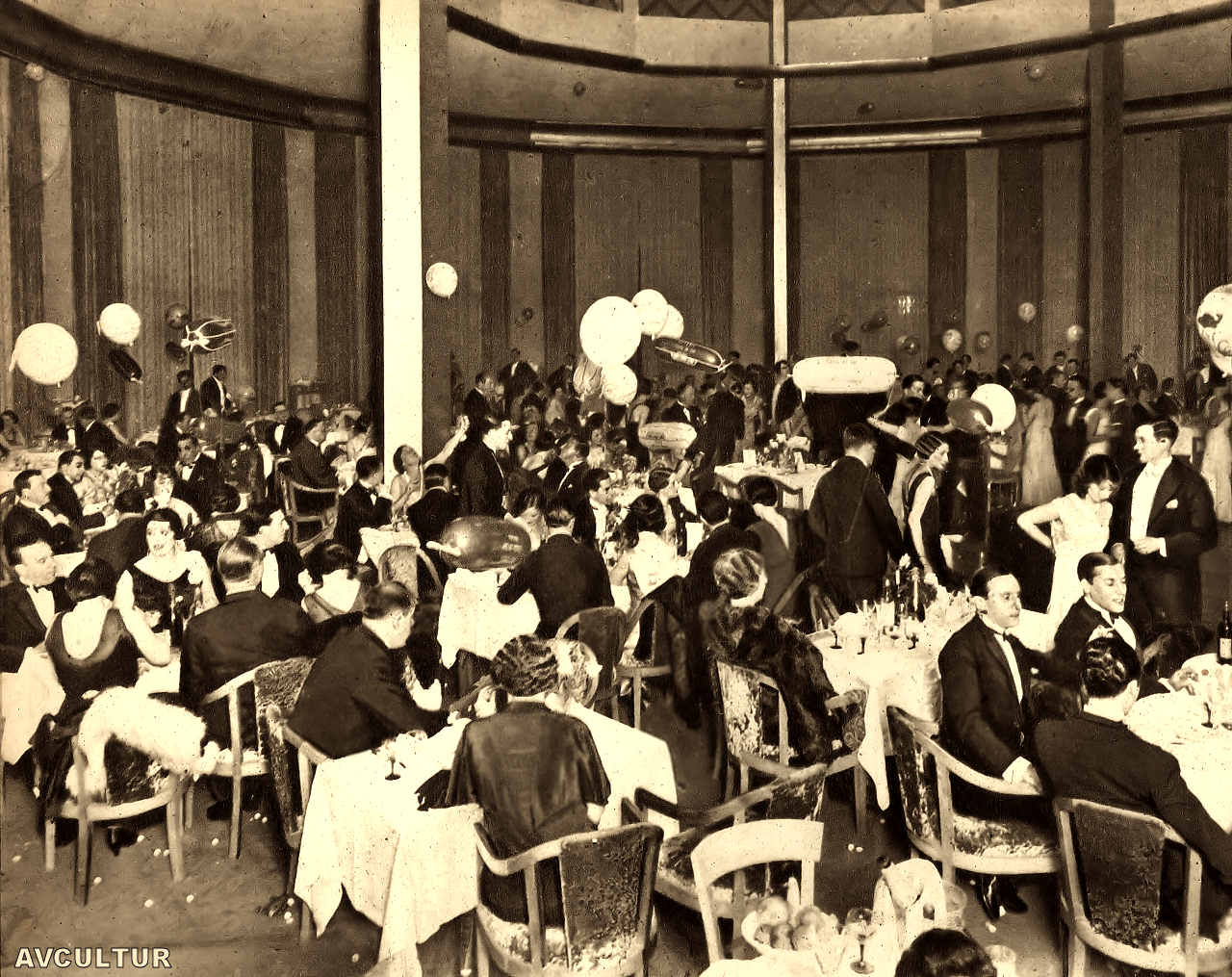 O Casino: Salão de restaurante, durante um jantar de gala. Le Casino: Salle à manger pendant un dîner de gala. The Casino-restaurant during a gala dinner.