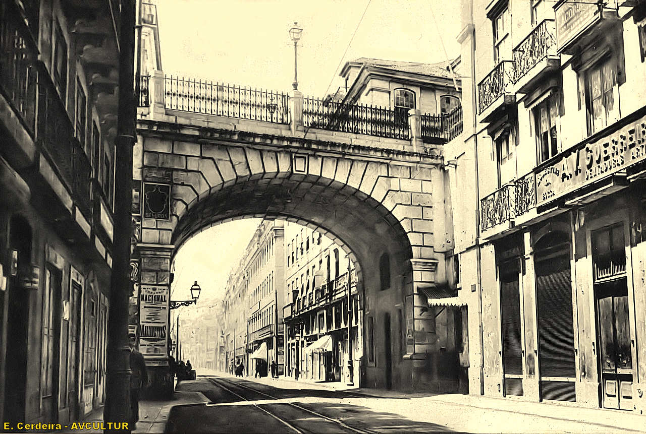 RUA DE SÃO PAULO, passando sob a RUA DO ALECRIM. – Aspecto do solo acidentado das colinas em que assenta o casario. O vigoroso claro-escuro dá-nos bem a impressão do que é a lux incomparável de Portugal. – País do sol. – Foto E. Cerdeira.