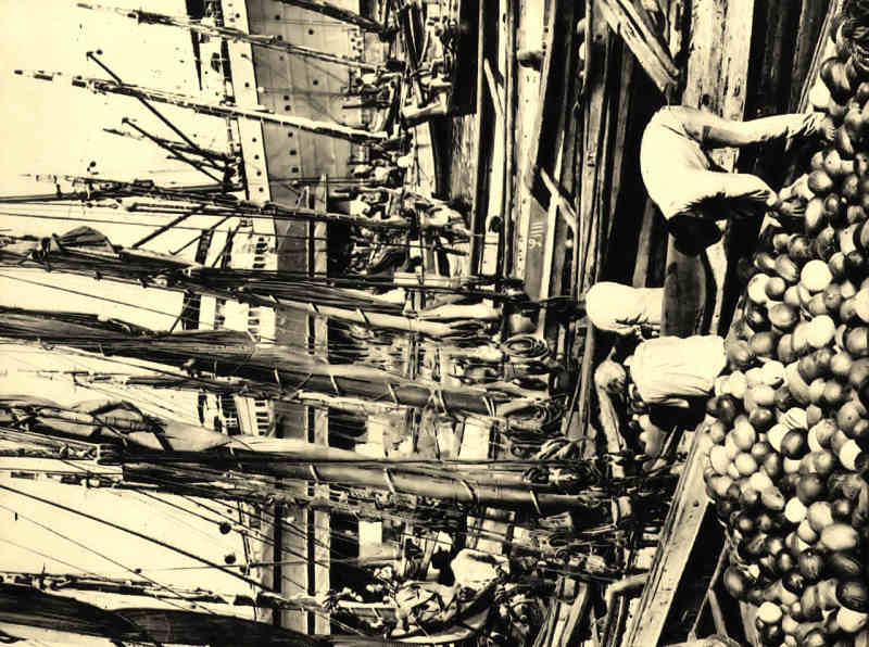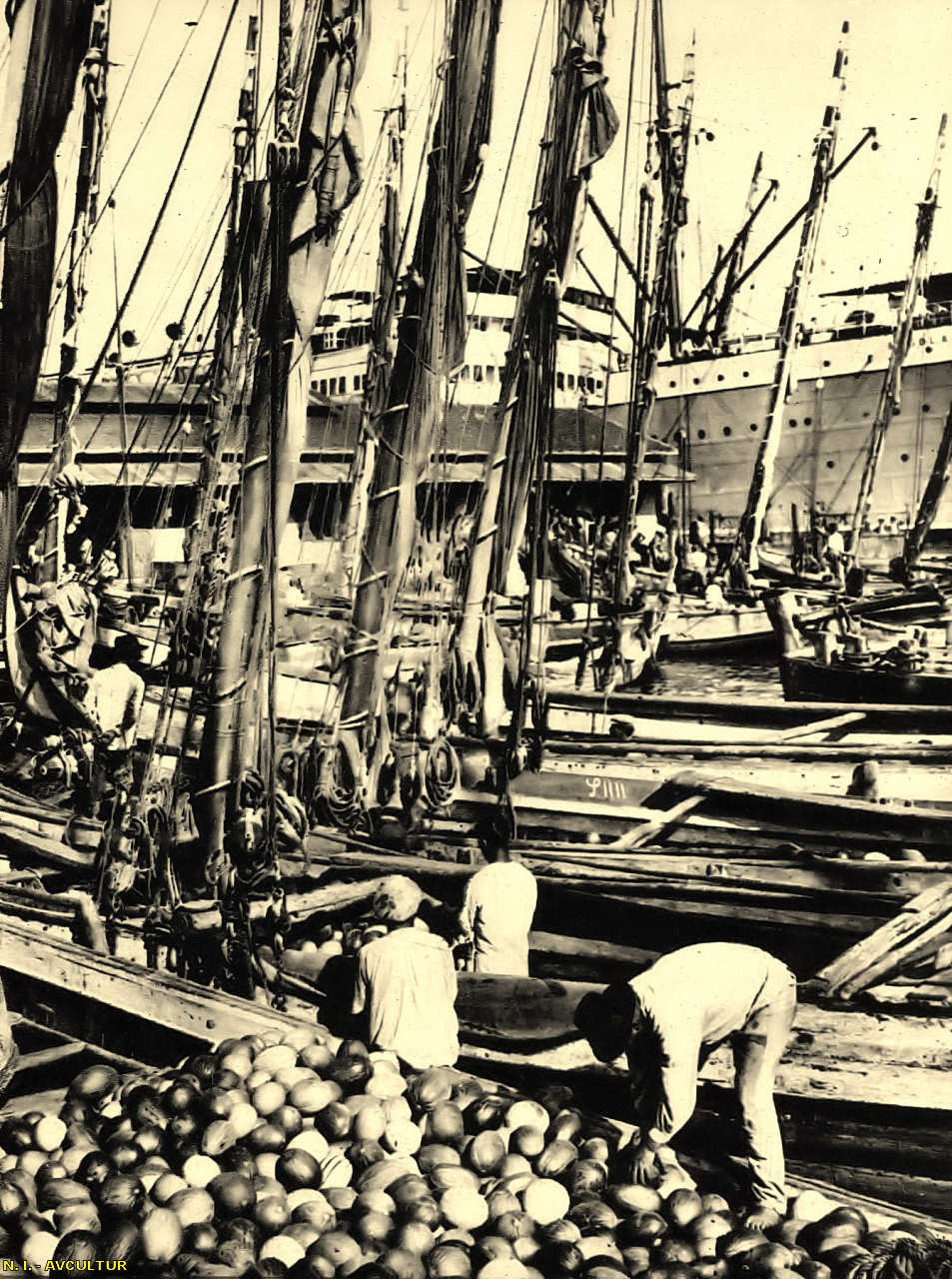 O CAIS DA RIBEIRA NOVA, à hora da faina. – Arrimado ao paredão, em descanso, um grupo de «fragatas», cujos mastros altos e amplas velas animam a placidez do rio. – Foto N. I.