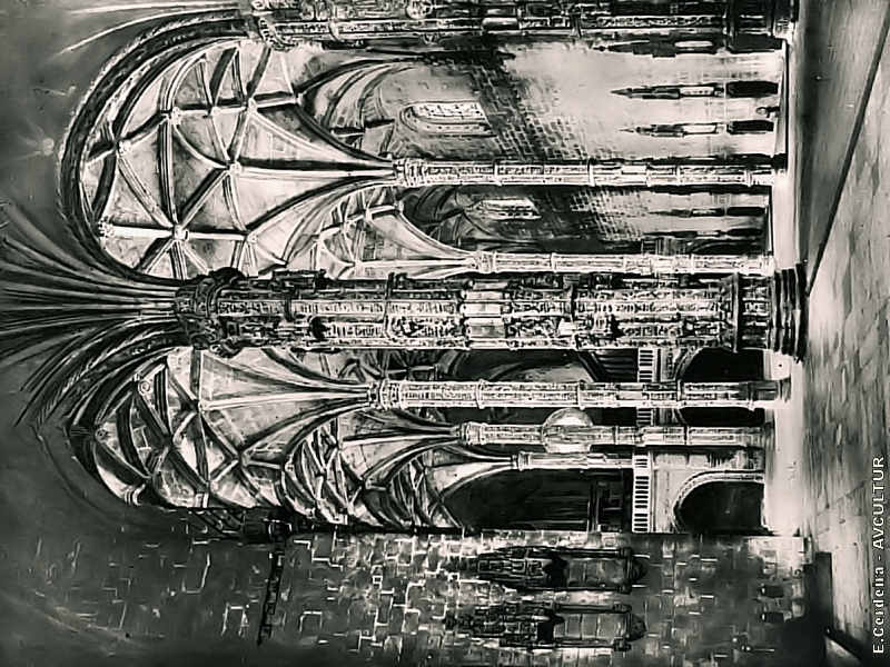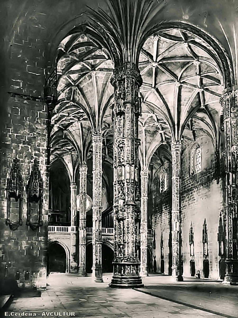 JERÓNIMOS – INTERIOR DA IGREJA – Três naves, ao gosto clássico; os pilares que as separam são, porém, tão fragilizados de lavores, que parecem cobertos por uma só abóbada.
