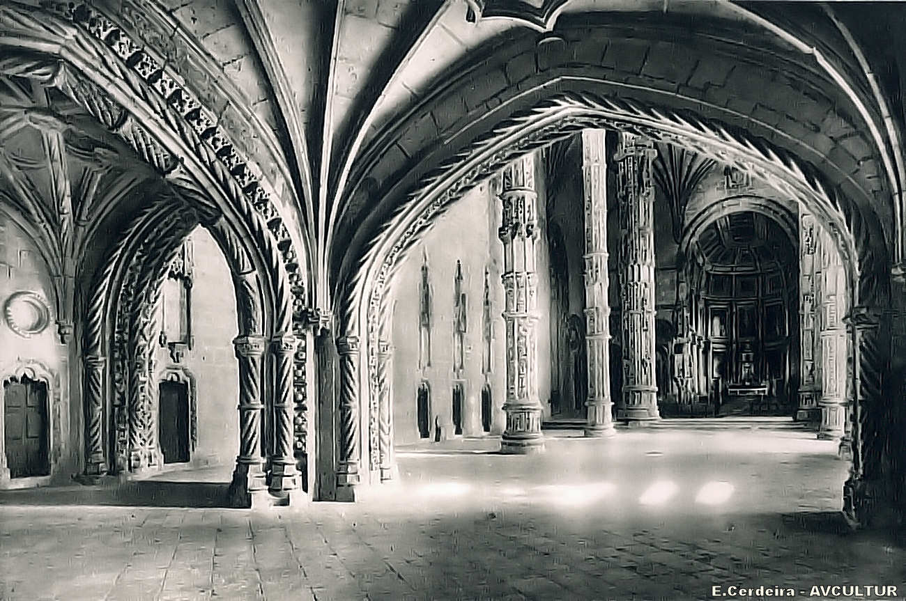 JERÓNIMOS – Aspecto do INTERIOR DA IGREJA, visto de sob o côro. Contrastando com a profusão decorativa dos arcos e pilares, de uma riqueza de joalharia, a nudez românica do muro lateral, portas simples e nichos graciosos, mas vazios de imagens.