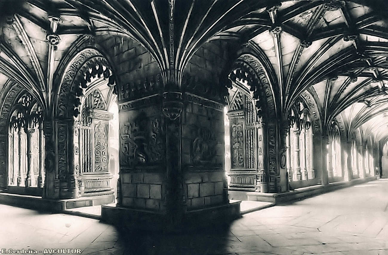 JERÓNIMOS – UM ÂNGULO DO CLAUSTRO, considerado dos mais notáveis de todo o mundo. Conjugados na mais bela das harmonias, a solidez das pilastras, a fantasiosa laçaria da abóbada e a delicadeza dos colunelos que sustentam os arcos de volta inteira.