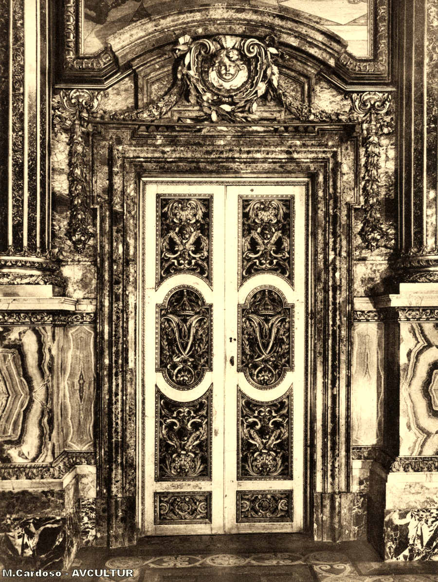 S. ROQUE – UMA DAS PORTAS LATERAIS da Capela, em bronze doirado (Silvestre Dória). As ombreiras são de verde antigo, espelhos de diáspora dura e conchinhas de ametistas.