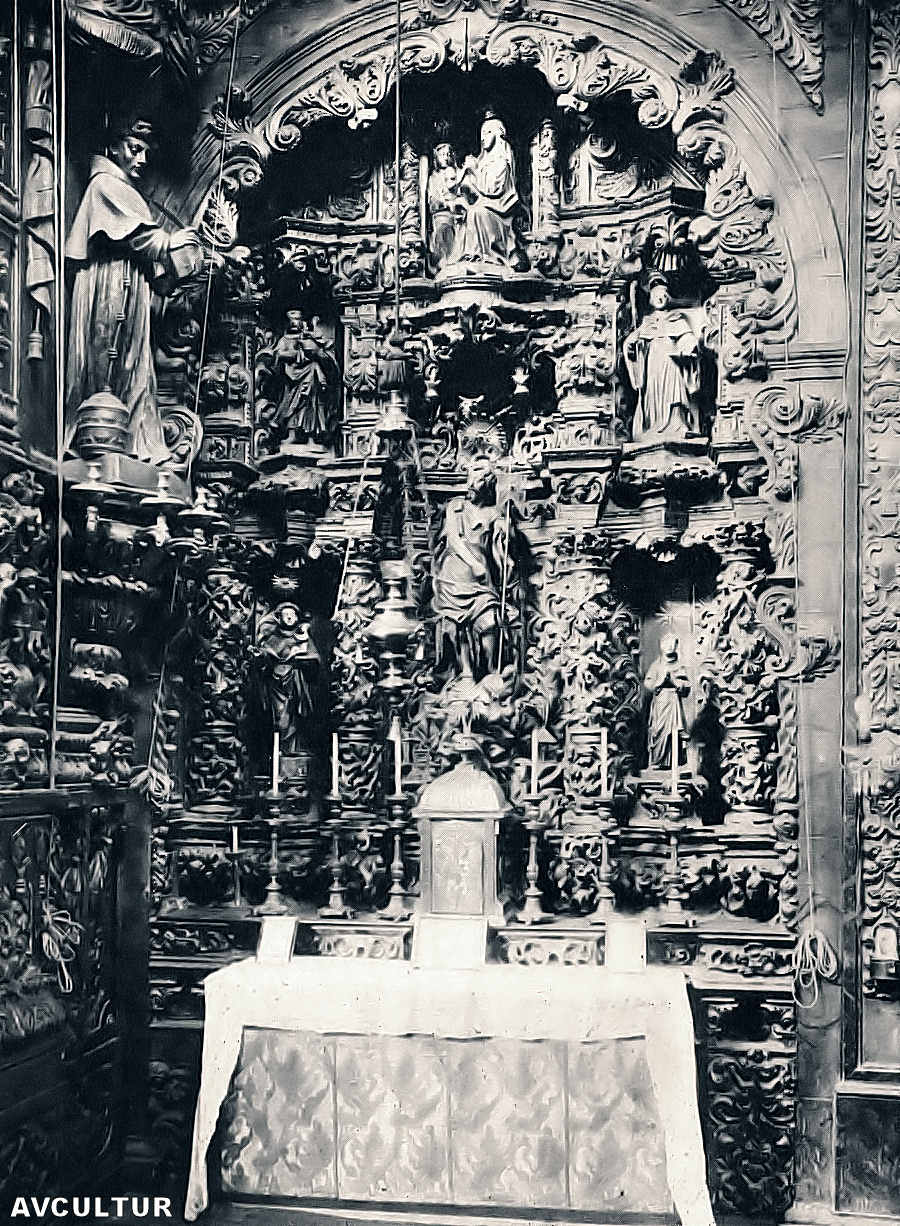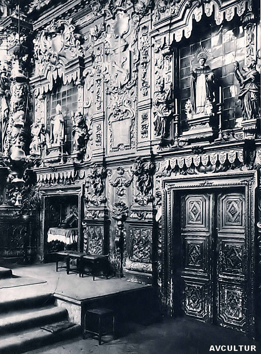 lateral; e um aspecto da capela-mor, da melhor talha.