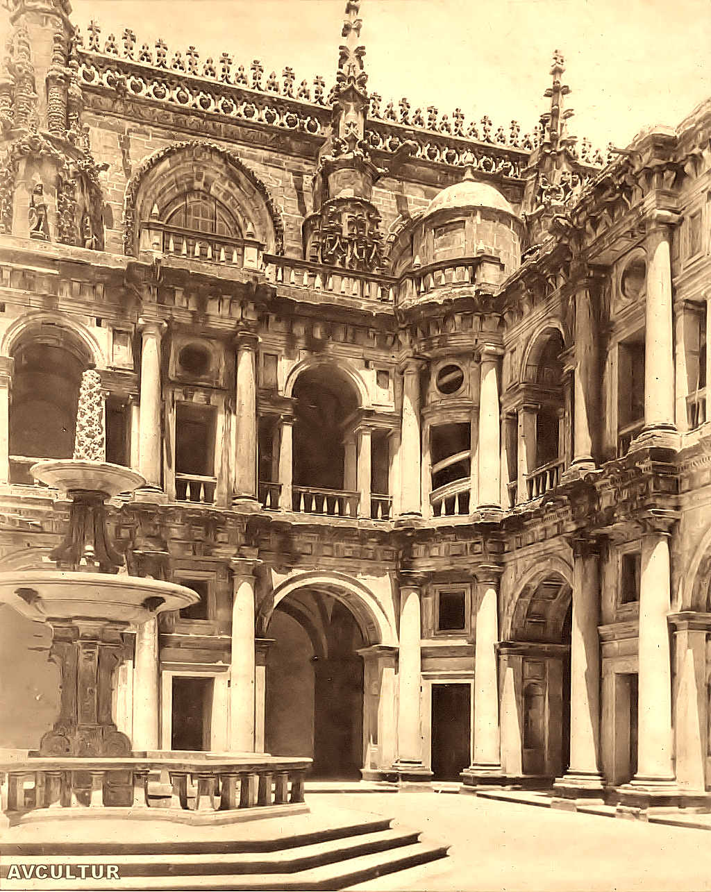 Corner of the sumptuous chief cloister witn Fernando Torre's fountain.