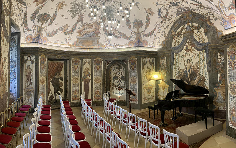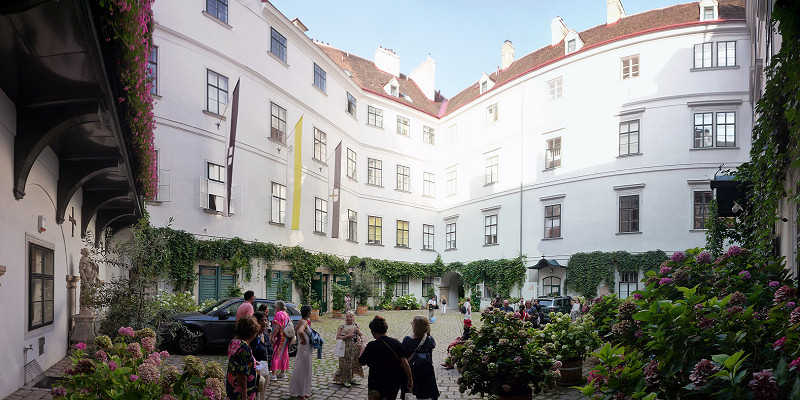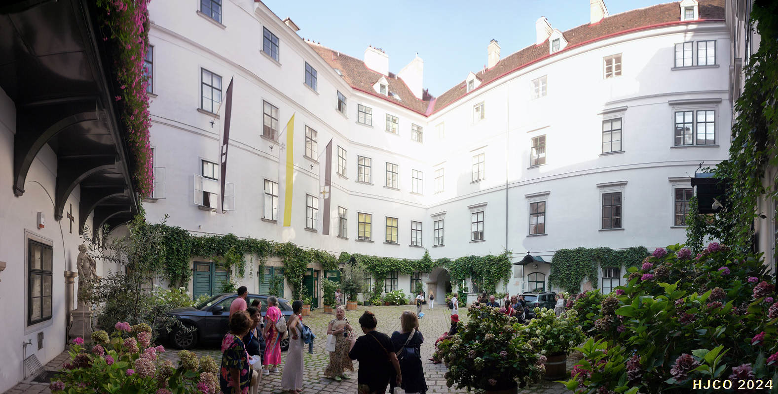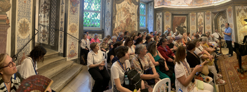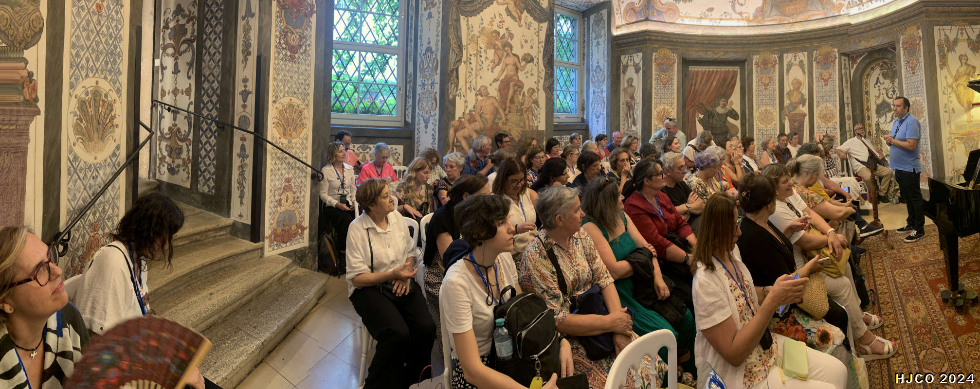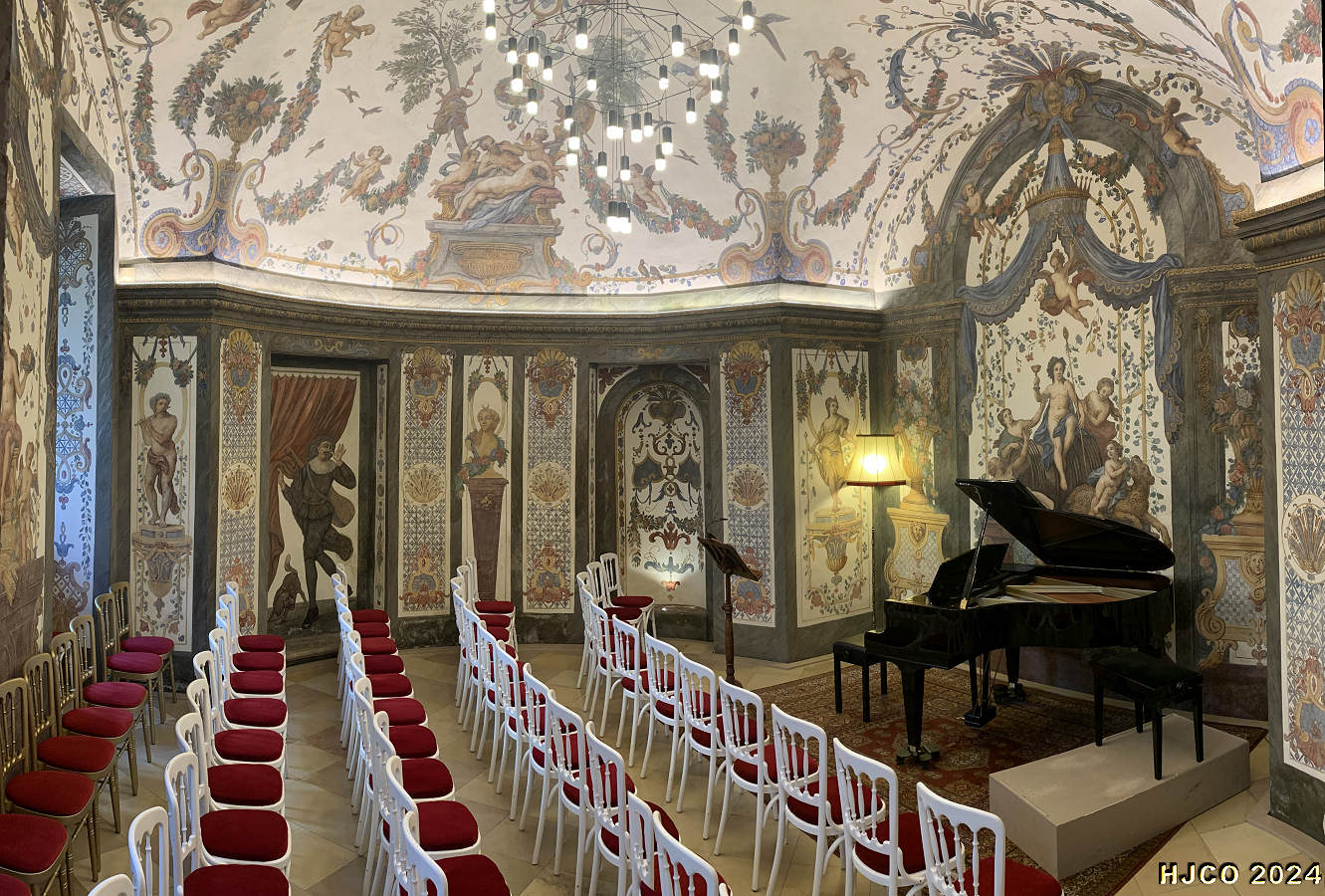 139. No pátio interior do edifício, aguardando a entrada na sala do concerto.. Panorâmica. Clicar para ampliar.