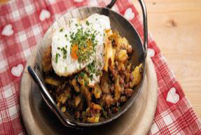 ovo, bacon salteado e cebola, podem ser consumidos como