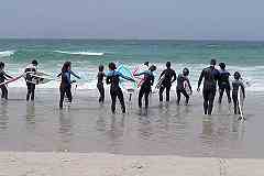 Houve uma sessão teórica sobre os cuidados a ter com o mar e com o material e o modo como funciona uma prancha dentro de água. Em seguida, já com os fatos vestidos, junto do mar fizeram o aquecimento e experimentaram a manobra básica para se porem em pé na prancha de surf: take off. A expectativa aumentava à medida que se iam dirigindo para o mar… Aí passaram o resto da manhã e grande parte da tarde, com grande sucesso.