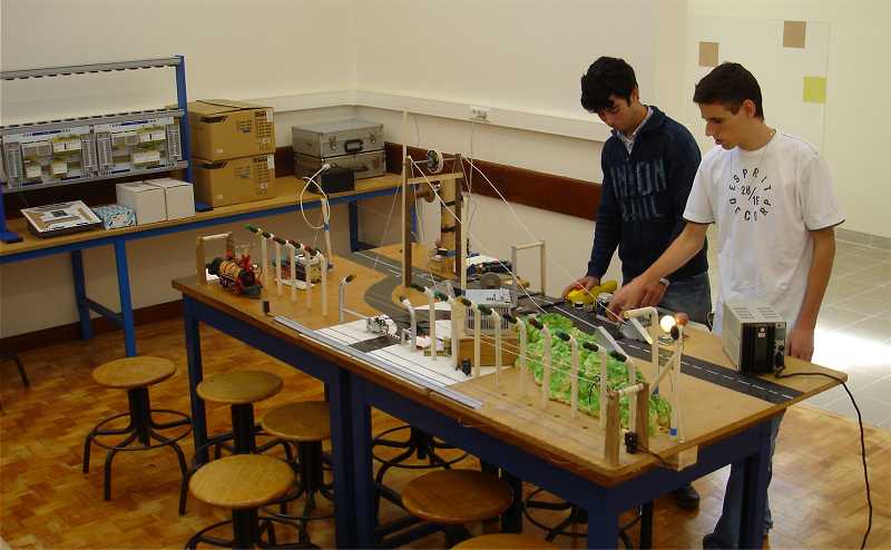 Jorge Quitério e  Alberto Sousa recriaram uma linha de montagem para transporte e manuseamento de cargas. É constituída por contactores, contactos auxiliares temporizados, e fins de curso com o objectivo de limitar o movimento, tanto do vagão, como do monta-cargas, que é realizado por dois motores monofásicos de corrente contínua, alimentados com tensão reduzida. O seu funcionamento é activado através de uma betoneira, que contem três botões: um de arranque normal que coloca o vagão em movimento no sentido do monta-cargas; o segundo é de paragem normal e o terceiro faz mover o vagão no sentido oposto. O circuito tem também um botão de emergência que desliga totalmente todo o processo, caso ocorra algum acidente de trabalho ou  outra anomalia. Todo o circuito está automatizado e é autónomo. Consiste no movimento em vaivém do vagão, assistido pelo monta-cargas. Todo este processo de transporte, elevação e despejo de material é comandado por um complexo sistema de automatismos industriais, sequenciais e a relés.