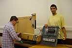 Jorge Quitério e Alberto Sousa junto ao projecto que construíram - linha de montagem para transporte e manuseamento de cargas pesadas.