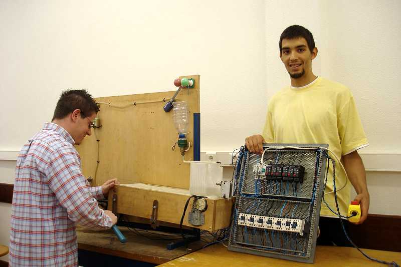 Jorge Quitério e  Alberto Sousa recriaram uma linha de montagem para transporte e manuseamento de cargas. É constituída por contactores, contactos auxiliares temporizados, e fins de curso com o objectivo de limitar o movimento, tanto do vagão, como do monta-cargas, que é realizado por dois motores monofásicos de corrente contínua, alimentados com tensão reduzida. O seu funcionamento é activado através de uma betoneira, que contem três botões: um de arranque normal que coloca o vagão em movimento no sentido do monta-cargas; o segundo é de paragem normal e o terceiro faz mover o vagão no sentido oposto. O circuito tem também um botão de emergência que desliga totalmente todo o processo, caso ocorra algum acidente de trabalho ou  outra anomalia. Todo o circuito está automatizado e é autónomo. Consiste no movimento em vaivém do vagão, assistido pelo monta-cargas. Todo este processo de transporte, elevação e despejo de material é comandado por um complexo sistema de automatismos industriais, sequenciais e a relés.