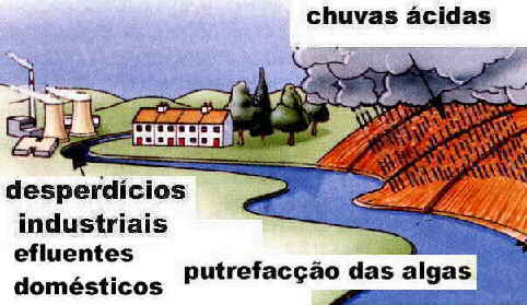 A figura seguinte apresenta esquematicamente as principais fontes de poluição das águas.