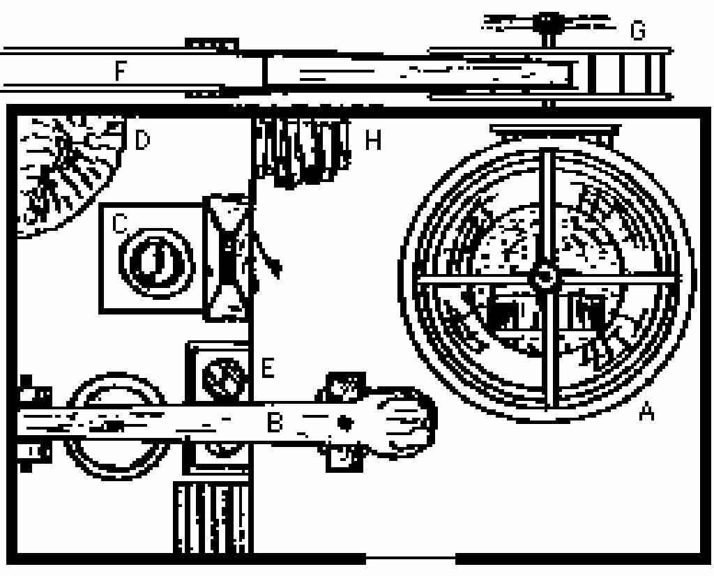 E-tarefas; F-conduta ou canal da água; G-roda hidráulica; H-casa das tulhas; I-tulhas;