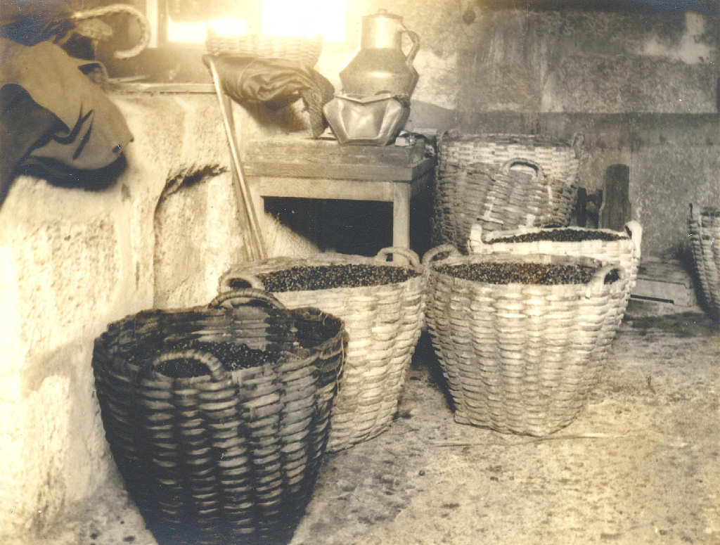 277, dist. de Coimbra. No chão, os chamados poceiros com azeitona. |