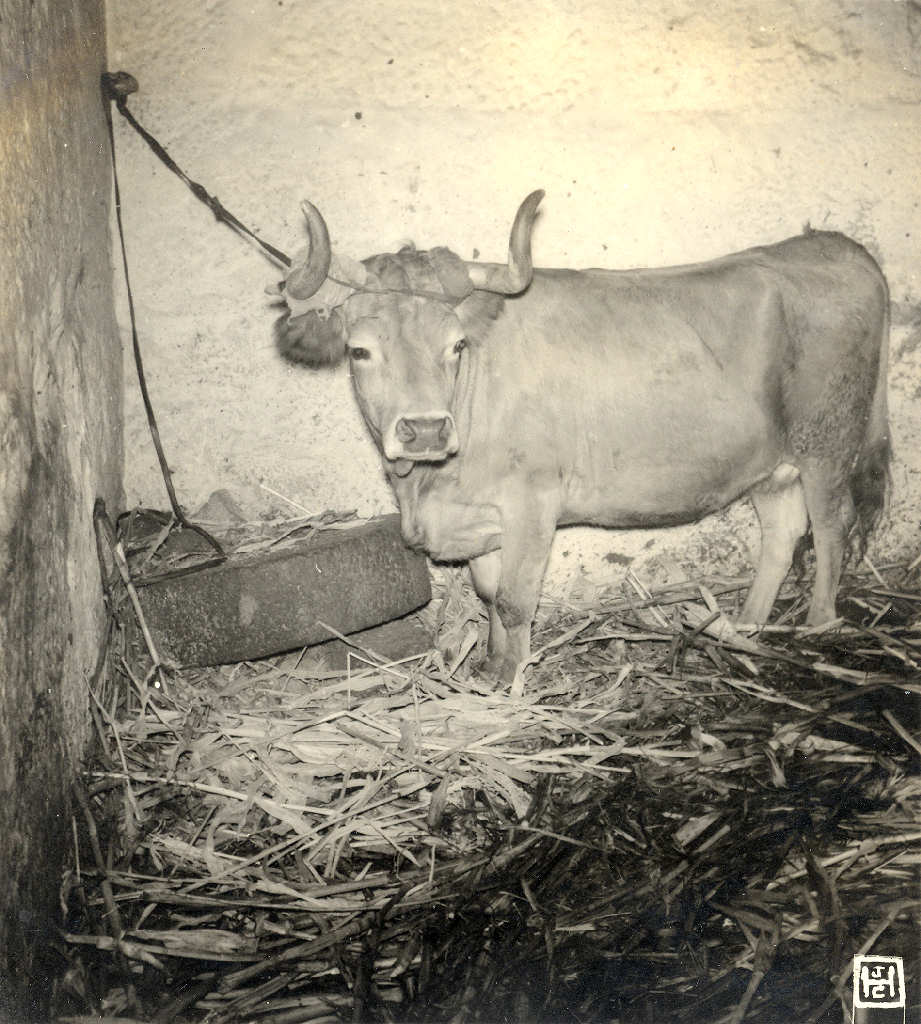 A moagem faz-se numa sala quadrada, ao lado da outra onde espremem a massa. A luz entra por uma pequena janela, juntando-se à produzida por uma lâmpada baça, colocada por cima do moinho. O chão está sempre coalhado de canas de milho, que o único boi, então conduzido por um rapazito de boina preta e vara ao ombro, vai pisando no seu lento caminhar. A um canto, um animal restabelece as forças, preso por uma correia à argola cravada na parede, imediatamente acima da manjedoura, que a fotografia que nós tirámos registou para sempre ou, pelo menos, enquanto a fotografia existir (veja-se a figura 17).