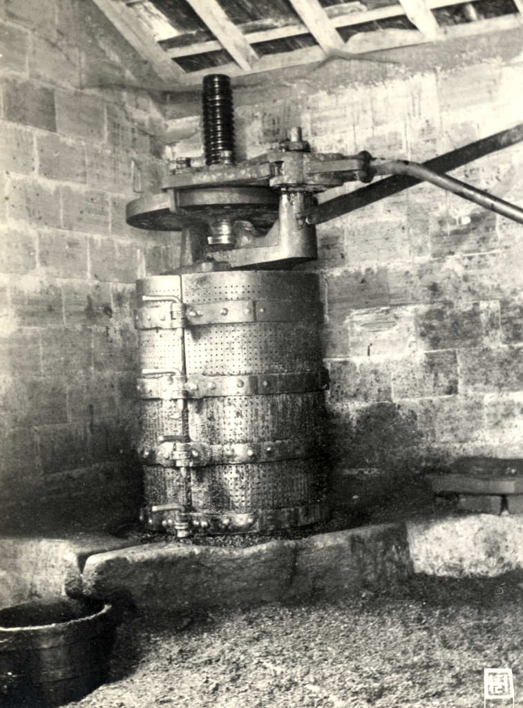 Mais concretamente, o cincho é uma prensa de parafuso de dimensões muito reduzidas – não ultrapassa o tamanho de um homem normal –, construída quase sempre inteiramente de ferro e utilizada para aperto do bagaço. Colocada a um canto do lagar, mais raramente em sala própria de pequenas dimensões, como é o caso do lagar de Sequeiros, P. 52, de que se reproduz a planta na figura 1, a prensa de cincho está assente sobre uma base circular de pedra, tendo a circundá-la um rego, por onde corre o azeite. A esta base é dado o nome de sertã (Porto, P. 52, 56, 57). Num dos lados apresenta uma ponta saliente ou um cano por onde sai o azeite, que cai dentro de um pote.