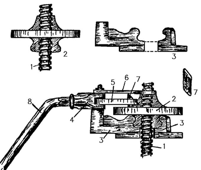 Essencialmente, o cincho é constituído por duas placas semi-circulares e por uma prensa de tipo Mabille. Esta, que é a parte principal de todo o conjunto e está esquematicamente representada na figura 91, trabalha num parafuso vertical (fig. 91, nº 1), solidamente cravado no centro da base de pedra. É constituída pelas seguintes peças: um disco dotado de orifícios no rebordo (nº 2), que enrosca no parafuso e dá o aperto à prensa; uma peça de base quadrada ou circular (nº 3), fixa na parte inferior do disco de maneira a permitir que este gire livremente; uma peça sobre o comprido (nº 4), que trabalha num eixo existente no braço da peça nº 3; duas pequena bielas (nº 5), fixas na caixa nº 4 e munidas cada uma de uma ranhura, onde correm duas cunhas de aço (nº 7), conhecidas em Sequeiros de Cima, P. 52, por macacos e cortadas em forma de bisel; um esticador (nº 6), que contribui para uma maior segurança de todo o conjunto; finalmente, uma alavanca (nº 8), introduzida na extremidade da caixa das bielas (nº 4), que, mediante movimento de vaivém, faz accionar a prensa, como daqui a pouco veremos.