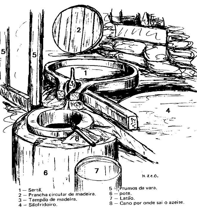 I.2 – Depois de sair o azeite que sai aqui do bagaço [refere-se o informador ao azeite que escorre da prensa­gem do bagaço numa prensa de cincho] eles tapam aqui este buraquinho (fig. 124, nº 5) (...) E por aqui sai a sangra. E depois estando este buraquinho cum rolhinho (nº 6), e deita aqui água (nº 4) e a água bai ò fundo, e o azeite bem aqui ò cimo e sai aqui (nº 1) p'ra uma basilha. E quando não tiver azeite, eles tiram o rolho aqui (nº6) e ficà sair a sangra por ali (nº5).»