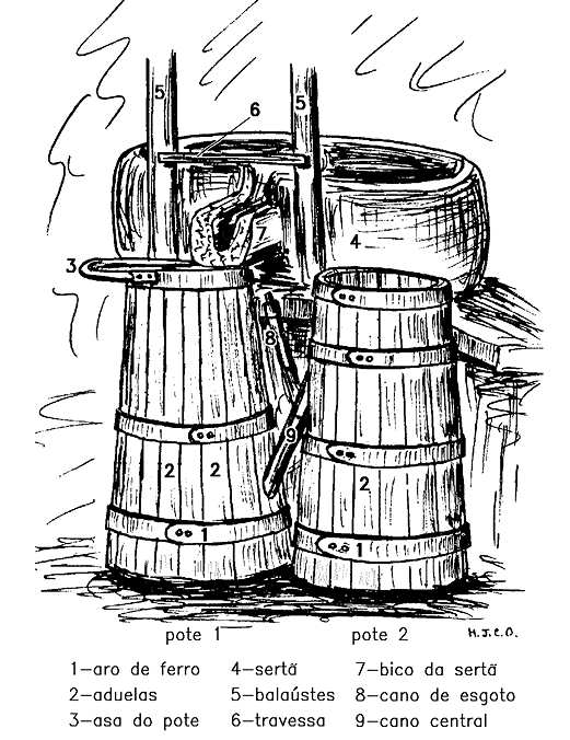 «Tem dois potes ligados um ao outro. São ligados por estes canos [8 e 9 da fig. 141]. A água caiu aqui; e o azeite fica e a água sai do fundo do primeiro pote e bem ò cimo deste. Alguns olhos que bem misturado na água sai outra bez do fundo deste e é que sai p'ra fora (...). Confor­me sai [da sertã], a água sai dacolá... a água e o azeite tudo misturado e depois é que depura aqui. O azeite é tirado c'uma medida, uma medida de litro ou de dois litros. Bai-se tirando, tirando, até chegar à água. Depois... e depois ò resto, sabe, tudo o qui é e entrega ò freguês.» (P. 118, Canelas de Baixo, freg. Canelas, conc. Arouca, dist. Aveiro).